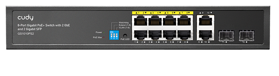 - Port count: 8 x Gigabit PoE, 2 x SFP, 2 x Gigabit Ethernet
